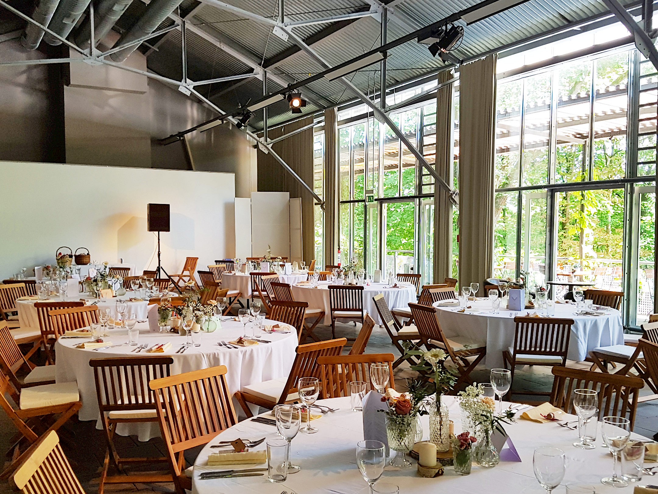 Ihr möchtet eine Hochzeit abseits des Mainstreams? Da haben wir für Euch genau den passenden Raum. Unser Oberhaus ist für individuell gestaltete Feiern ideal. Modern und lichtdurchflutet, groß ohne ungemütlich zu wirken ist es für die „etwas andere“ Hochzeitsfeier geradezu perfekt. Habt Ihr Lust auf einen Sternenhimmel? Lichtershows kommen in diesem Saal besonders gut zur Geltung. Unsere Floristin, die bereits unzählige Brautpaare mit ihren individuellen Dekorationen und ausgefallenen Ideen glücklich gemacht hat, ist auch mit diesem Metier bestens vertraut. Maximale Personenzahl 180